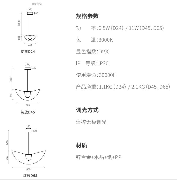 利用材料物理弹性,,透过巧妙的结构,,,灯罩在空间里呈现一个富有张力和生机的曲面,,,仿佛在空间里热烈绽放的花朵,,,灯罩表面采用手工敷纸工艺,,,更加的朦胧舒适,,,纸纤维的材质也让灯光更加温柔。。。选用实心高级无铅水晶材质,,,这种材料洁净无瑕的透明度与低色散特性,,,,硬度高,,,,多用于精密光学器件及高端水晶制品,,,,更好展现丰富光影质感。。。。